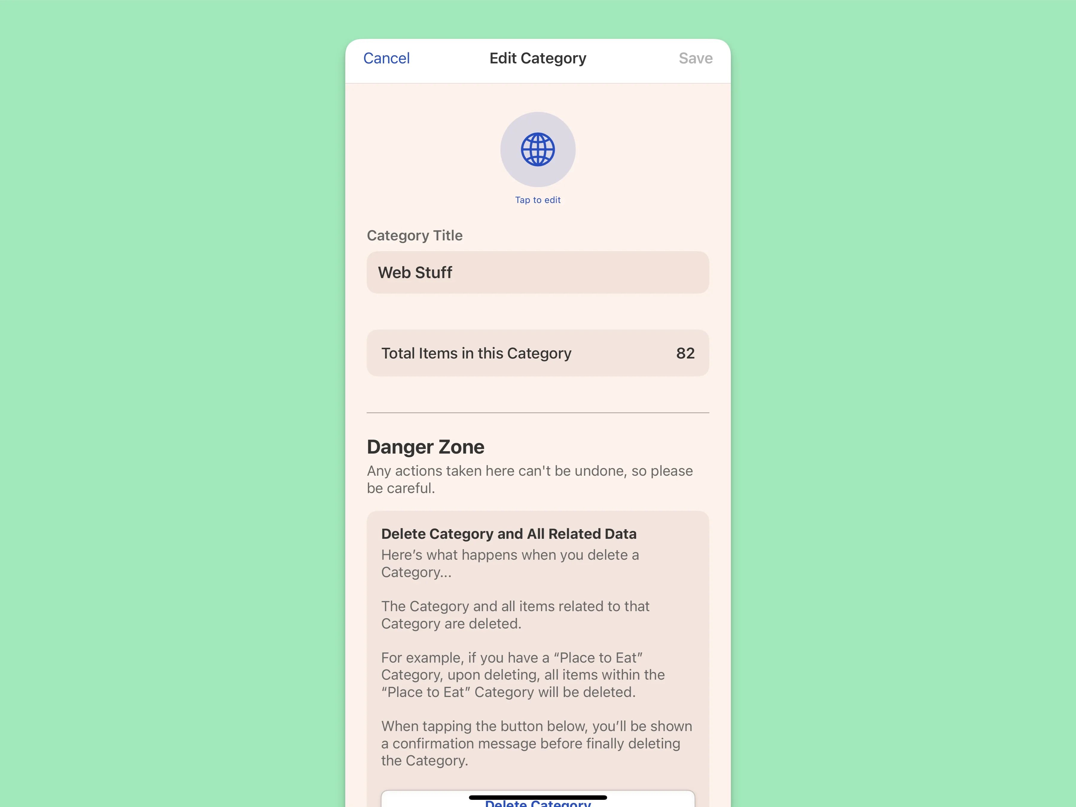 When tapping the Delete Category button, you’ll be shown a confirmation message before finally deleting the Category.