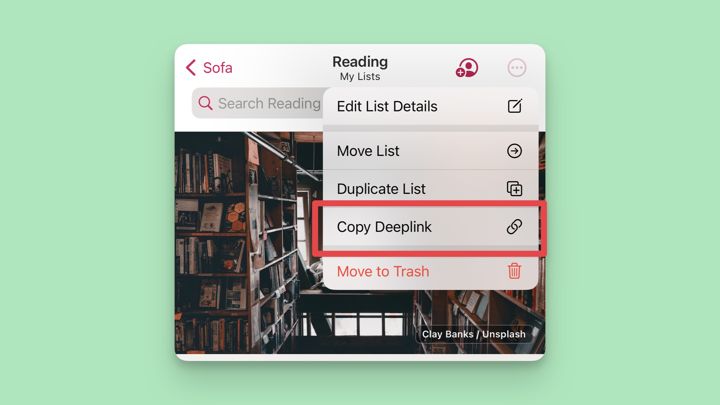 The easiest way to get a deeplink for a specific list is to copy it from within the app. Tapping the ••• button in the top right of a list will reveal an option to Copy Deeplink. This will copy the link for that specific list to your clipboard.